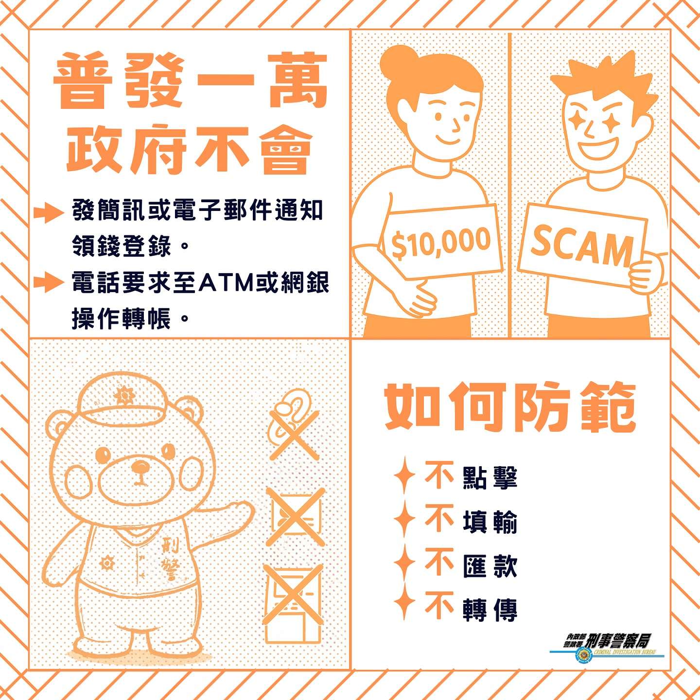 防詐!普發現金一萬元詐騙宣導近期「普發現金一萬」為熱門話題,易遭詐騙集團作為誘騙民眾受騙之話術,顯有加強防制之必要,內政部警政署撰寫防制普發現金一萬詐騙文案,加強推播,以落實識詐宣導。