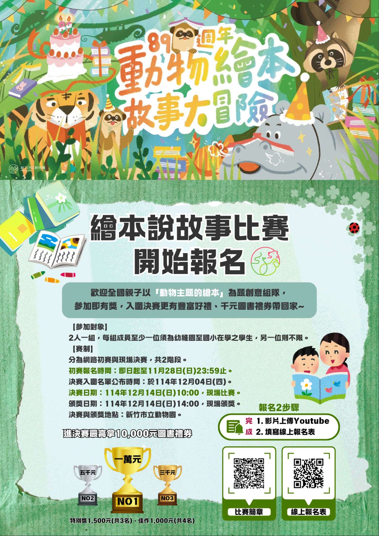 二、為了推廣動物與環境保育,本市動物園特別舉辦「說故事比賽」,符合參賽資格者皆有參加獎,進入決賽最高拿一萬元圖書禮卷,獎品豐富,請協助轉知附件海報及簡章予貴校家長知悉,鼓勵踴躍參加。