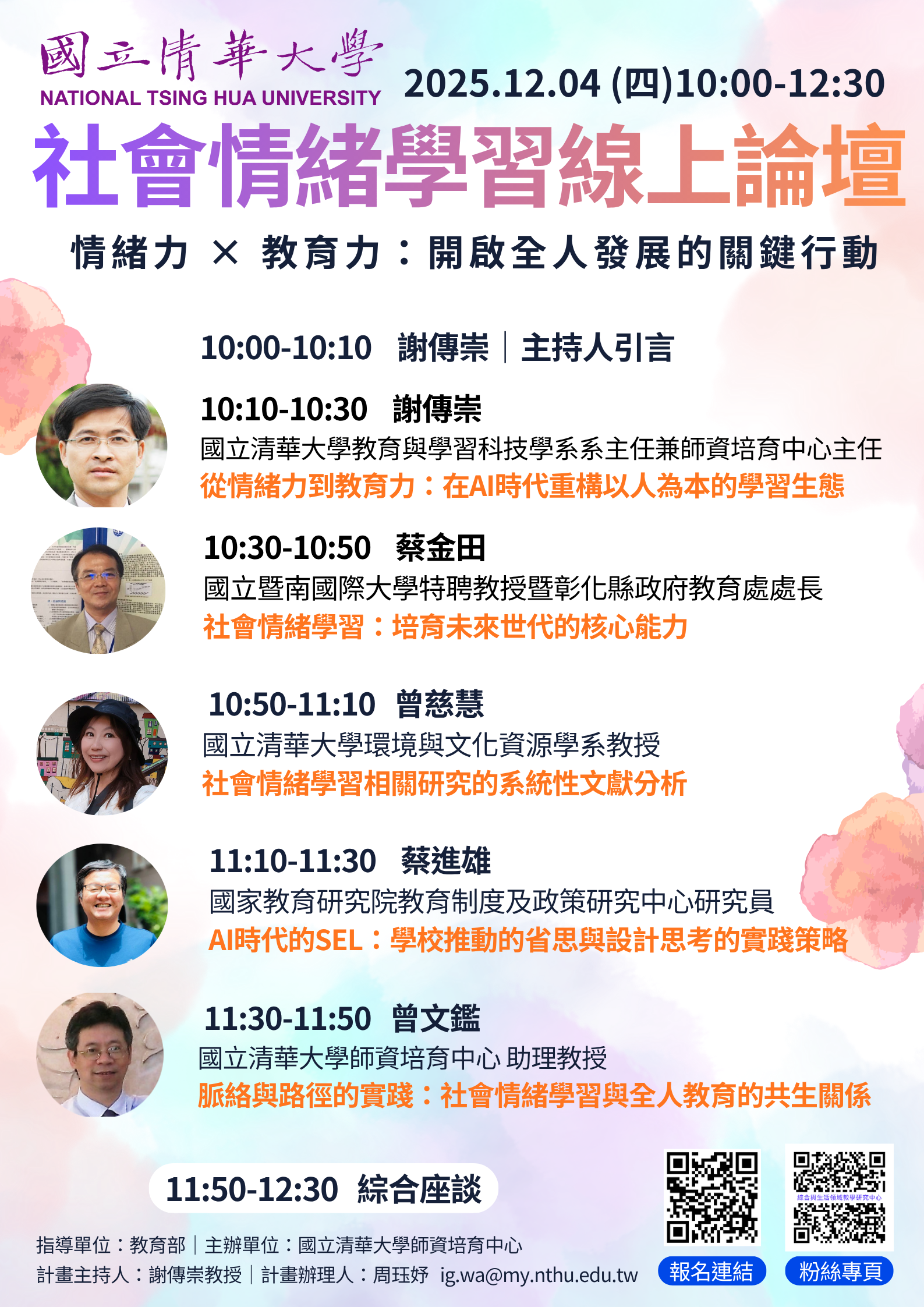 | 主旨: | 轉知國立清華大學師資培育中心訂於114年12月4日上午10時至12時30分,辦理「社會情緒學習線上論壇-情緒力 × 教育力:開啟全人發展的關鍵行動」線上論壇,請查照。 |