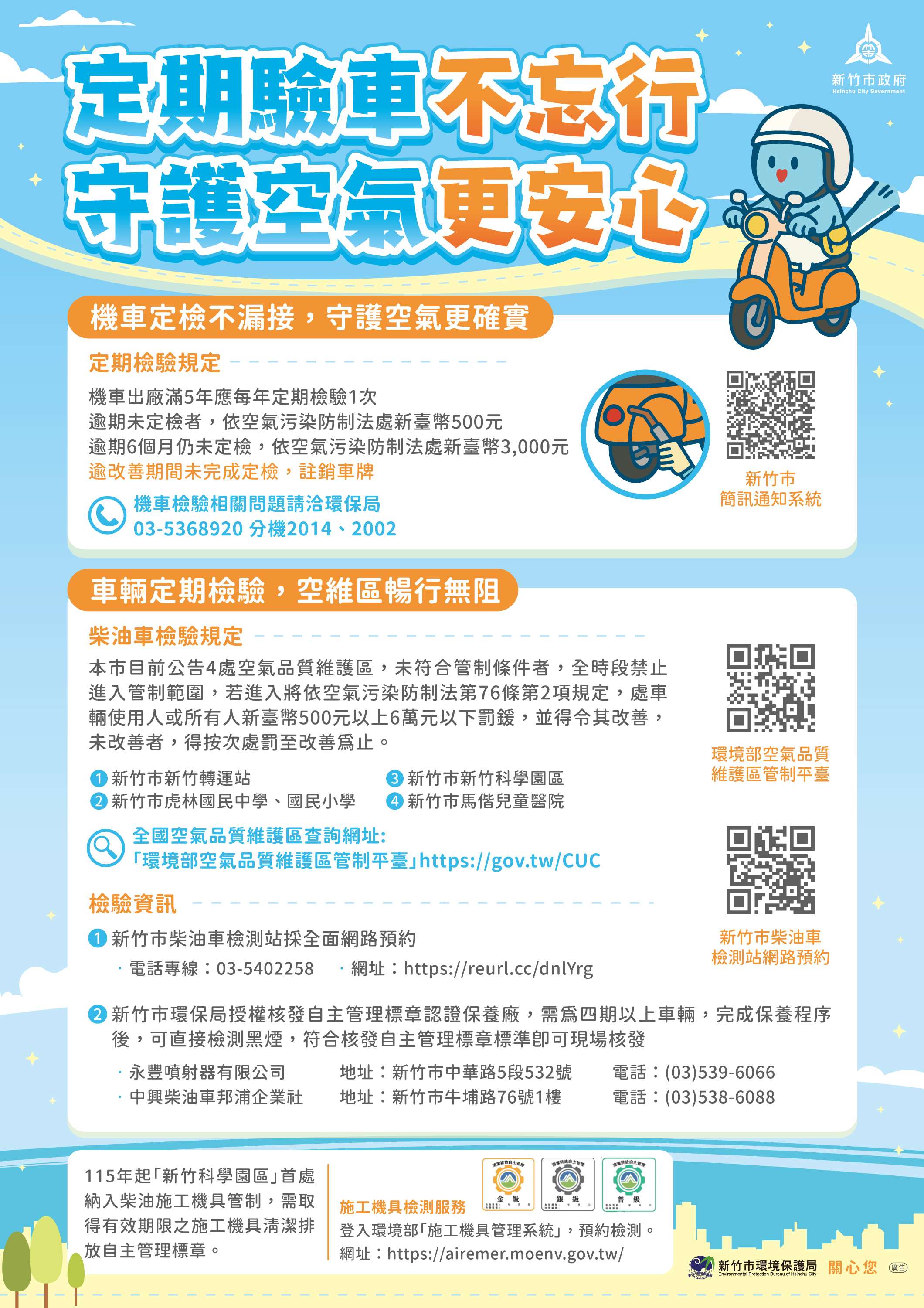 一、機車車輛出廠滿五年應每年定期檢驗1次,逾期未定檢者,依空氣污染防制法處新臺幣500元以上1 萬5,000元以下罰鍰,最重得註銷牌照。