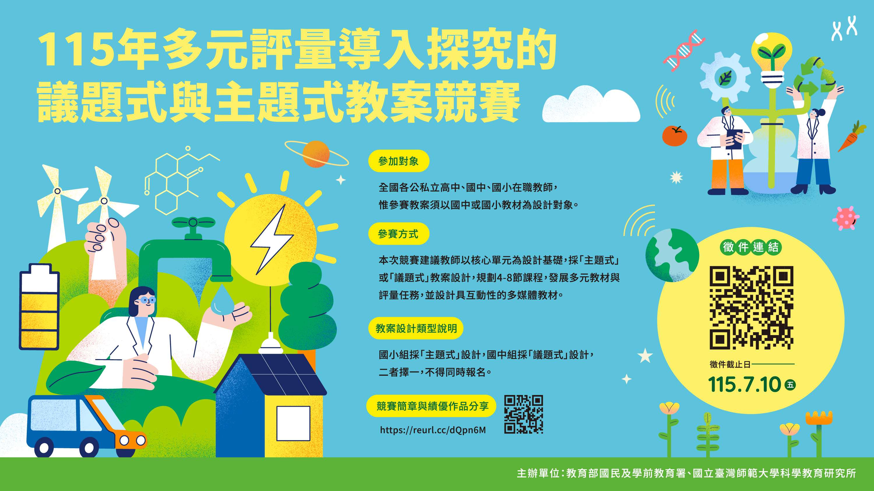 | 2、 | 旨揭競賽建議教師採「主題式」(國小課程)或「議題式」(國中課程)做教案設計,規劃4-8節課程,發展多元教材與評量任務,並設計具互動性的多媒體教材。 |