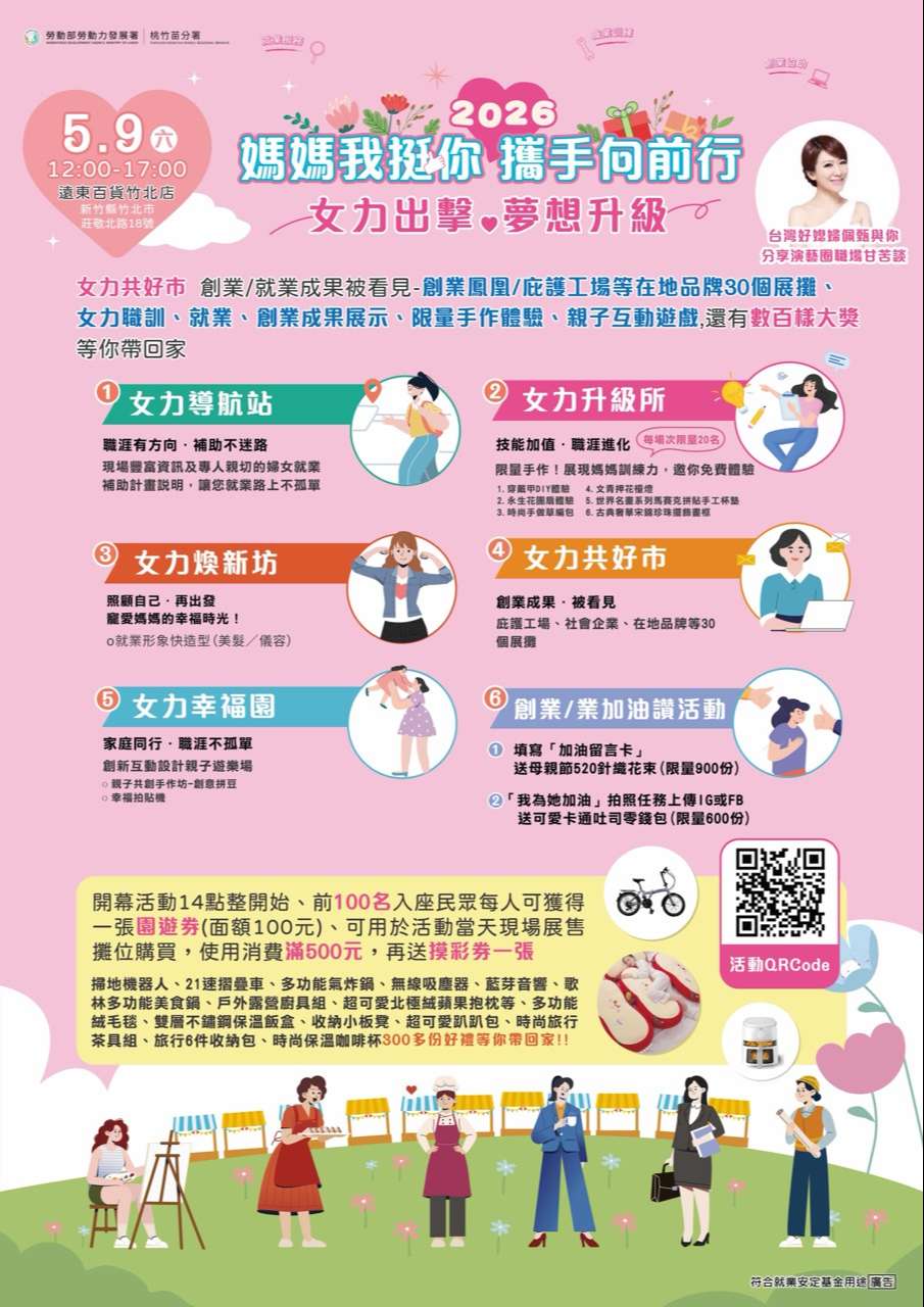 勞動部勞動力發展署桃竹苗分署為推廣婦女就業發展與在地產業,特別於母親節前夕舉辦「2026媽媽我挺你 攜手向前行」活動市集。現場集結多家在地創業品牌與成果展示,誠摯邀請各位家長與同學利用週末前往參加,共同支持多元創業能量!