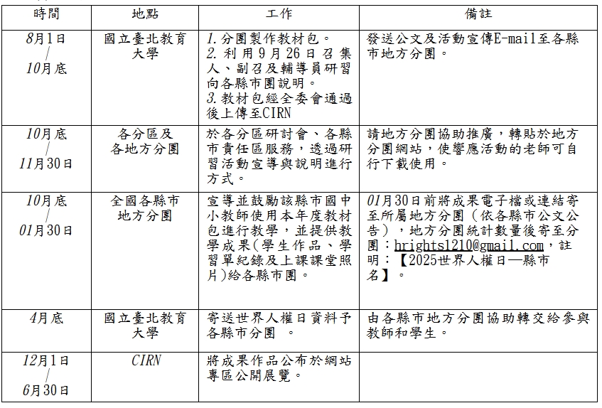 (三)將學生學習成果及上課課堂照片上傳至網路平台(如:Youtube頻道或社群網站),設為公開,並將連結寄至所屬地方分團統整為成果網頁,再由地方分團將成果網頁網址彙整寄至中央分團,公開展示在2025世界人權日專區。