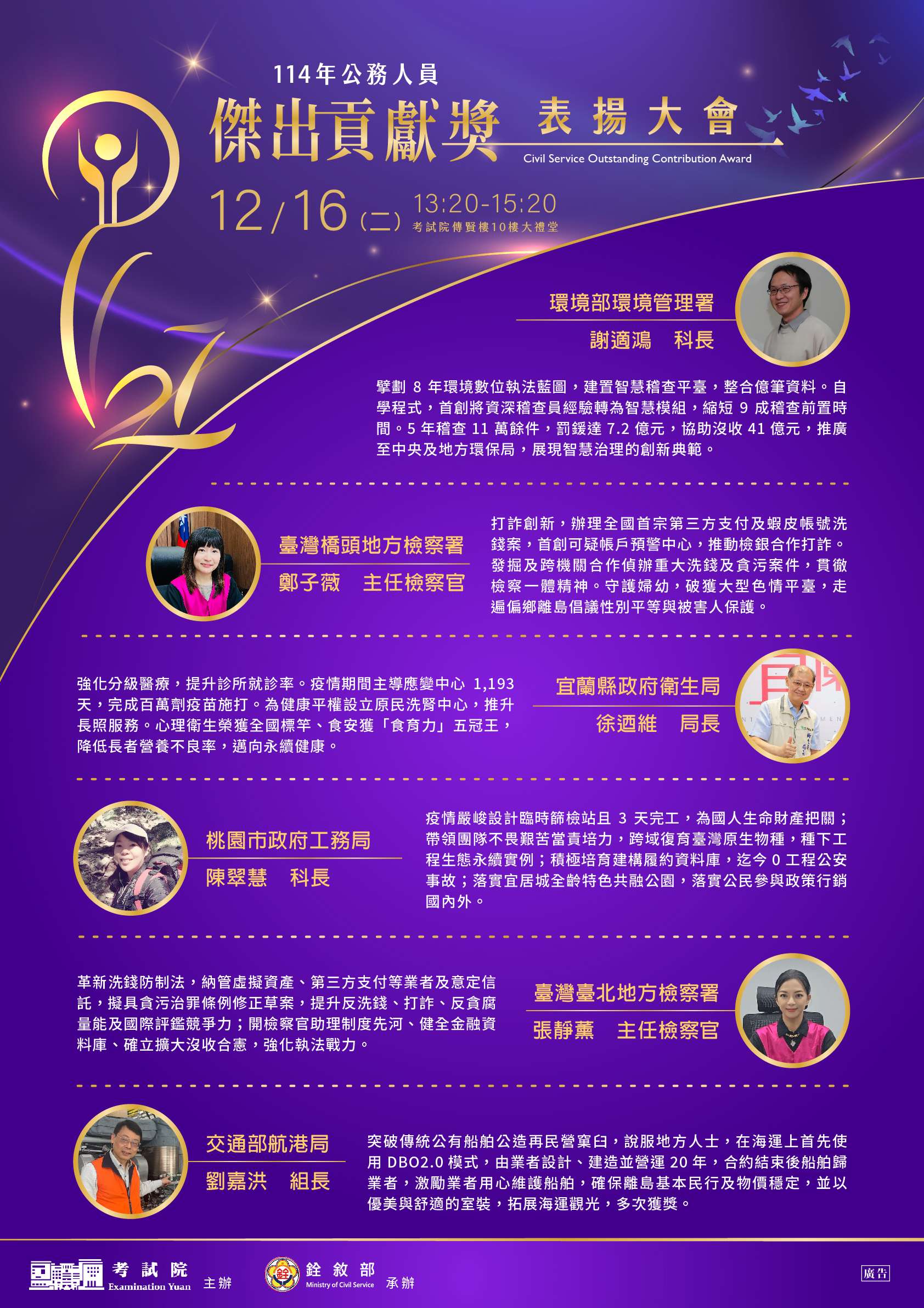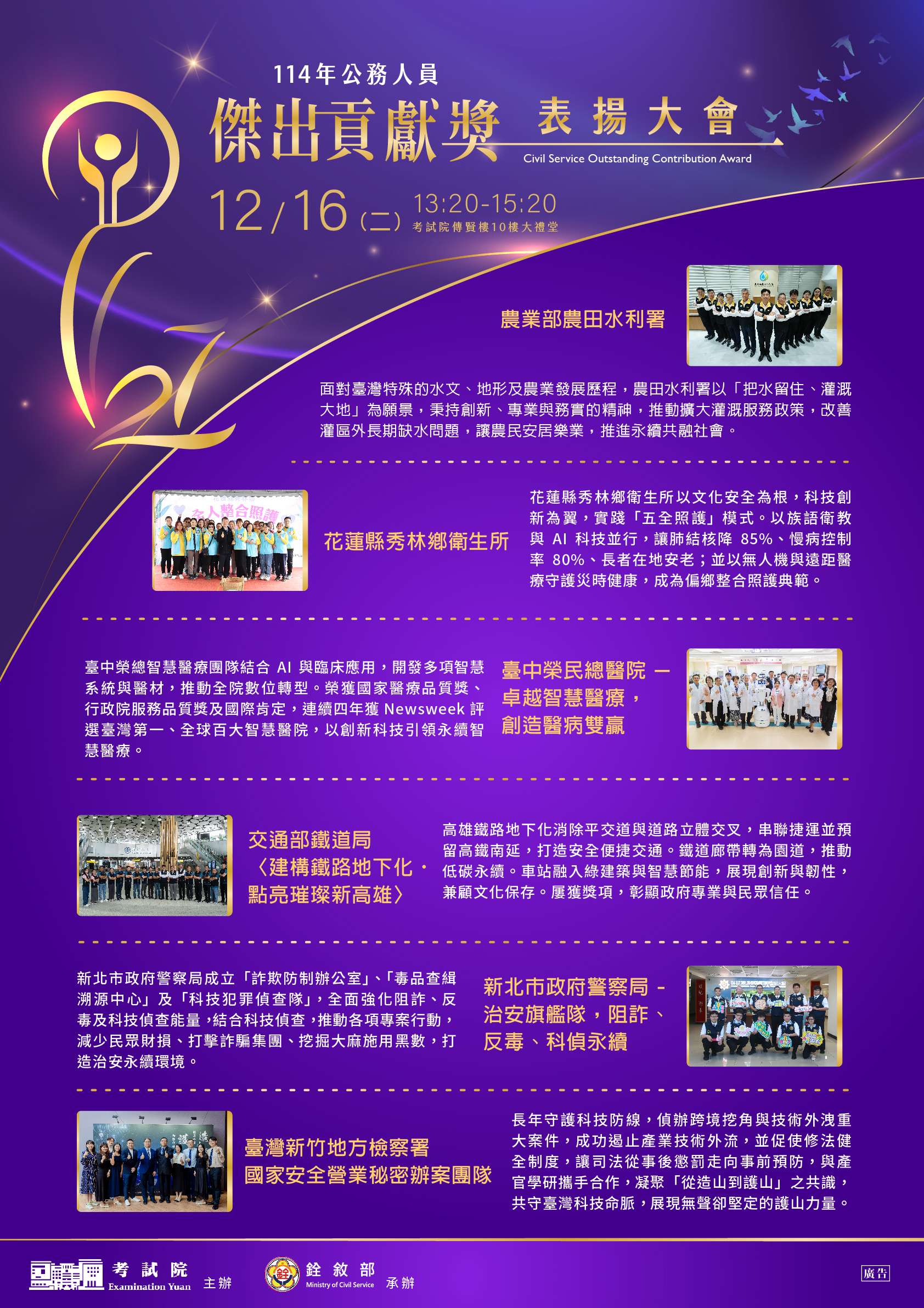 銓敘部書函請協助公告「114年公務人員傑出貢獻獎表揚大會」電子海報。