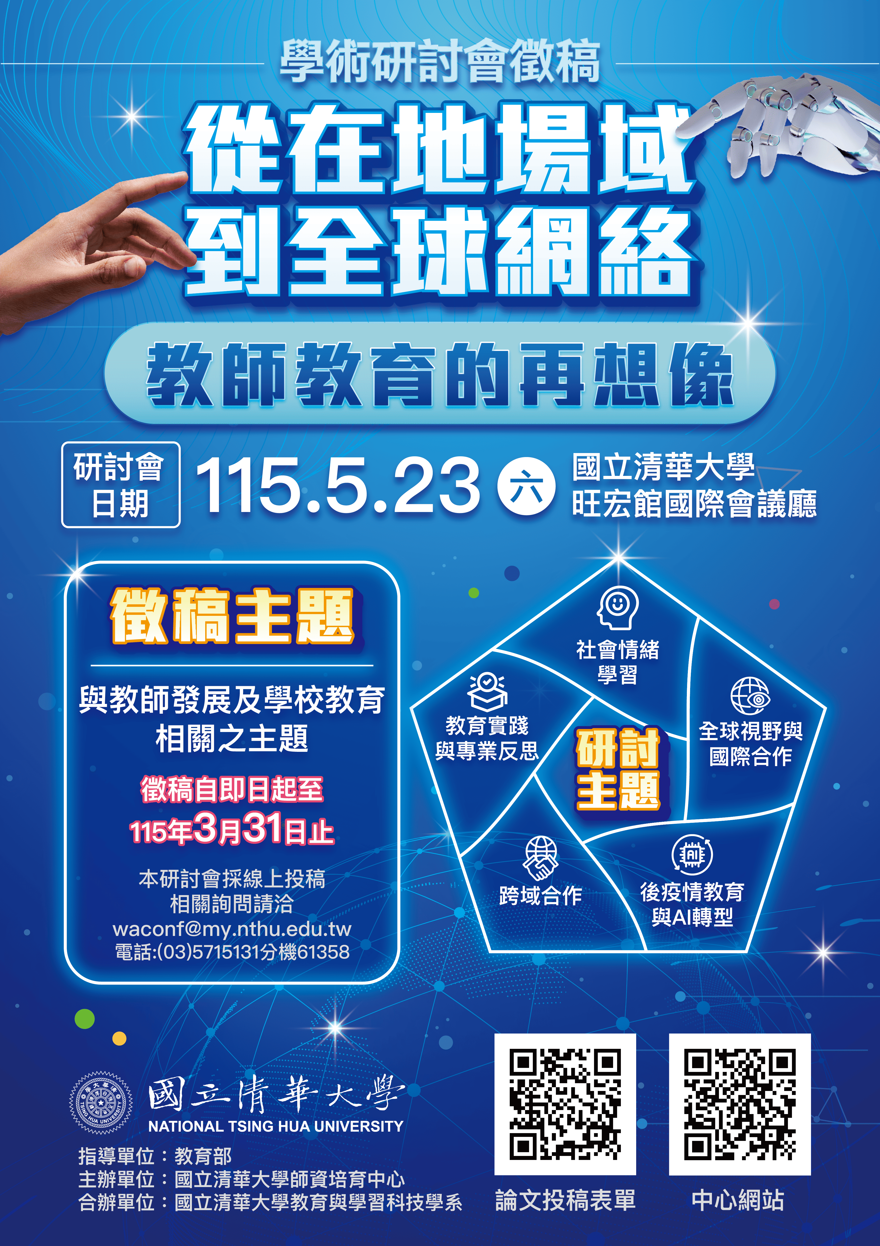 | 主旨: | 檢送國立清華大學師資培育中心辦理「從在地場域到全球網絡:教師教育的再想像」學術研討會徵稿公告及海報,請查照。 |
