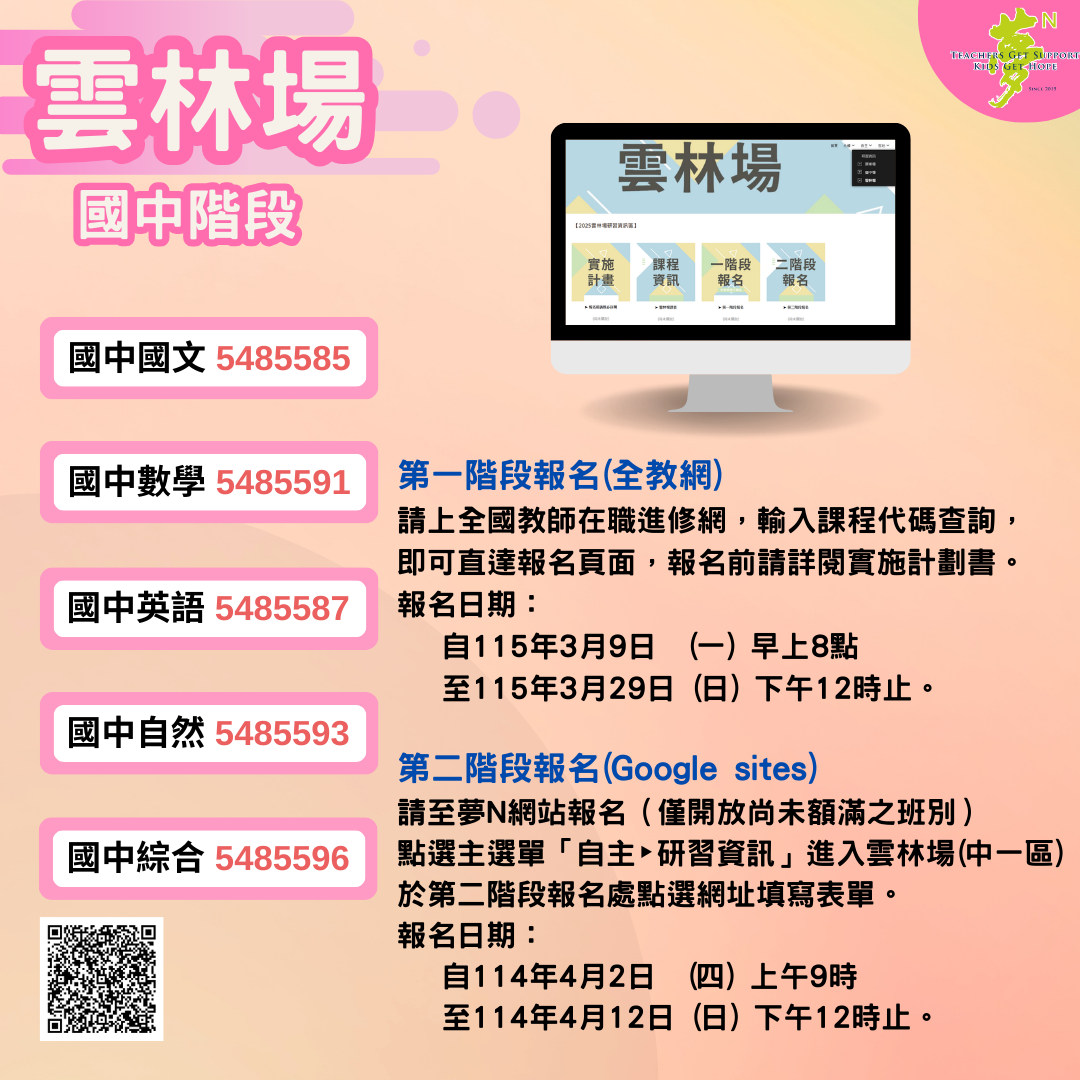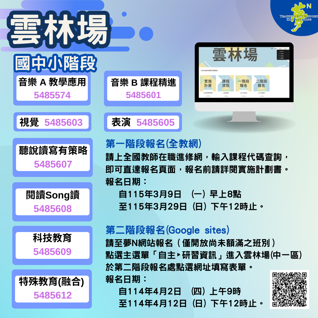 | 二、 | 115年度教師專業成長研習實施計畫-夢的N次方素養工作坊-中一區雲林場研習資訊如下: |